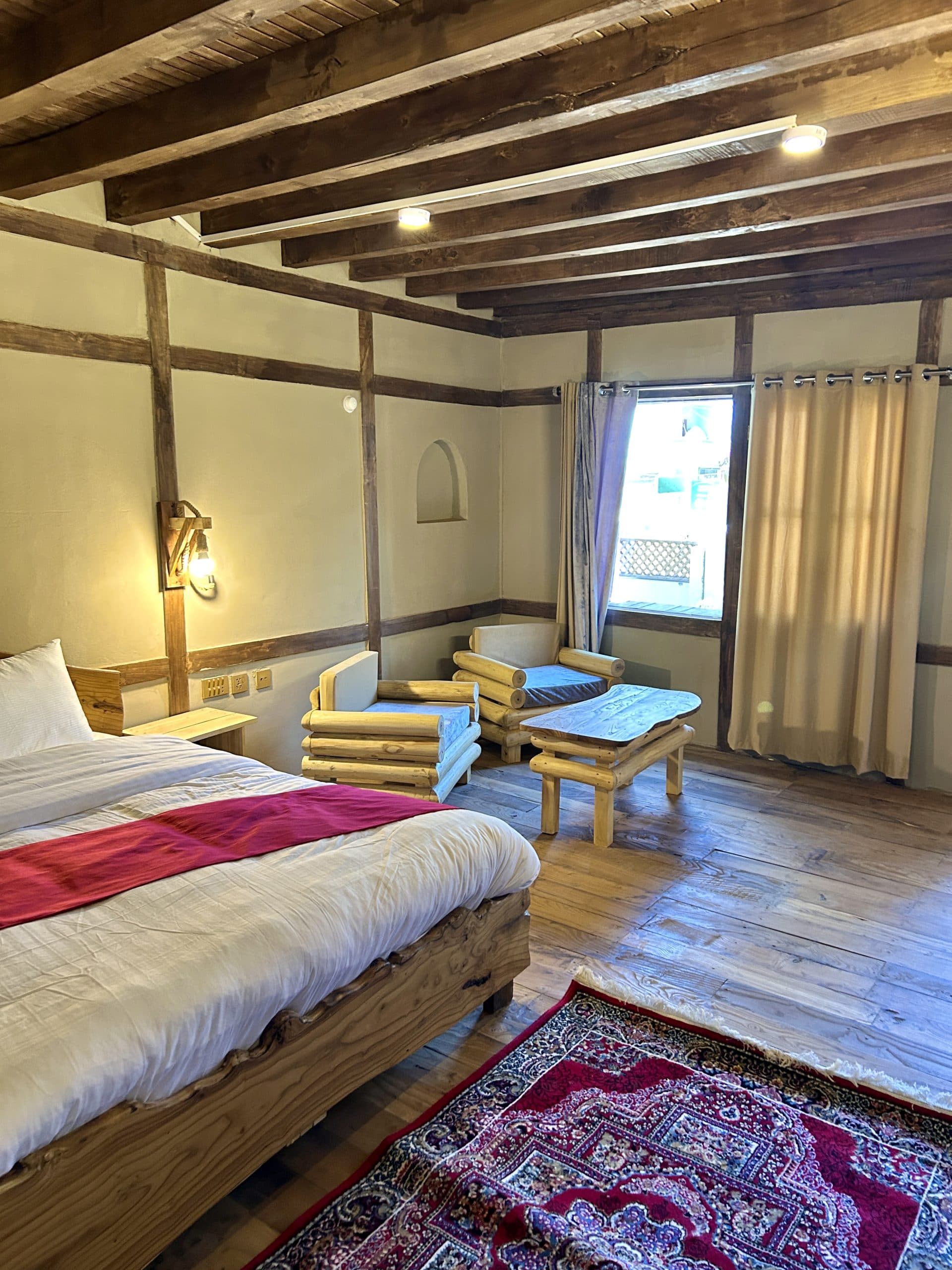 The Family Suite at Zimsa Resort Skardu is thoughtfully designed for families or small groups who prefer extra space and a relaxed environment during their stay. The suite can accommodate up to four guests and includes one queen size bed along with two sofa beds, offering flexible sleeping arrangements. A private bathroom with both shower and bathtub is provided, along with free toiletries and a hairdryer for everyday comfort. The suite is equipped with air conditioning and heating to suit Skardu’s seasonal weather, as well as a flat screen TV, tea and coffee maker, electric kettle, dining area, desk, wardrobe, and clothes rack. Guests can enjoy pleasant garden views that add to the peaceful atmosphere of the room. Located on the ground floor, the suite is easily accessible and convenient for families traveling with children. Breakfast is typically included, making the stay practical and value focused for visitors exploring Skardu.