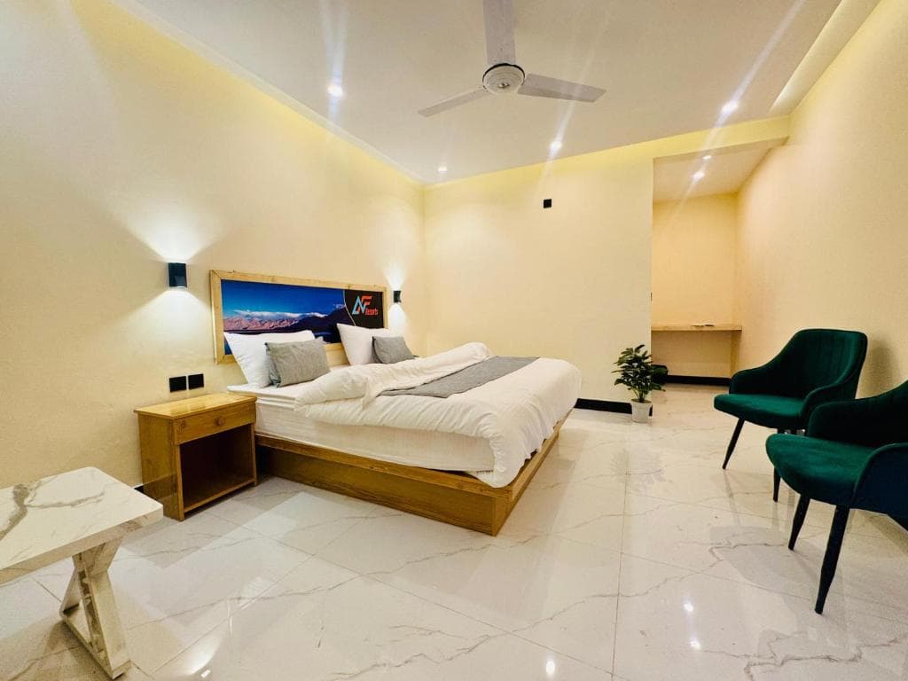 The Standard Double Room at North Fields Resorts is a boutique style resort stay on Airport Road in Skardu, ideal for couples, families, and nature lovers who want a calm atmosphere close to the city. The room offers a comfortable double bed, a private bathroom, air conditioning, and free Wi Fi, along with daily housekeeping to keep the stay smooth and tidy. Many rooms include a balcony or terrace that opens to scenic garden, river, or mountain surroundings, adding a relaxed outdoor feel. The resort supports guests with a 24 hour front desk, room service, free private parking, and a complimentary airport shuttle for easier arrivals and departures. Breakfast options are available as continental or halal, and an on site coffee shop provides refreshments. Tour and transport assistance is also offered for exploring nearby attractions such as Deosai National Park and Sadpara Lake.