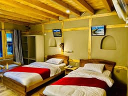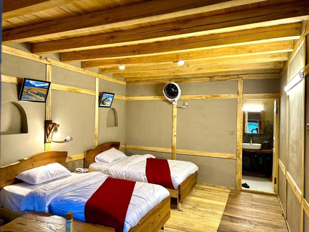 The Twin Room at Zimsa Resort Skardu is designed for travelers who want a comfortable and practical stay surrounded by natural beauty. The room features two single beds along with two sofa beds, making it suitable for two adults and up to one child. It includes a private bathroom equipped with both a shower and a bathtub, along with complimentary toiletries and bathrobes for added convenience. Guests can relax on the balcony overlooking the garden, offering a calm and refreshing atmosphere. Inside the room, amenities such as air conditioning, a flat screen TV, work desk, dining table, tea and coffee maker, clothes rack, and wake up service support both short and extended stays. Located on the ground floor, the room is easily accessible and convenient for families. Continental breakfast is generally included, and the resort is well suited for travelers looking for value, comfort, and a quiet environment in Skardu.