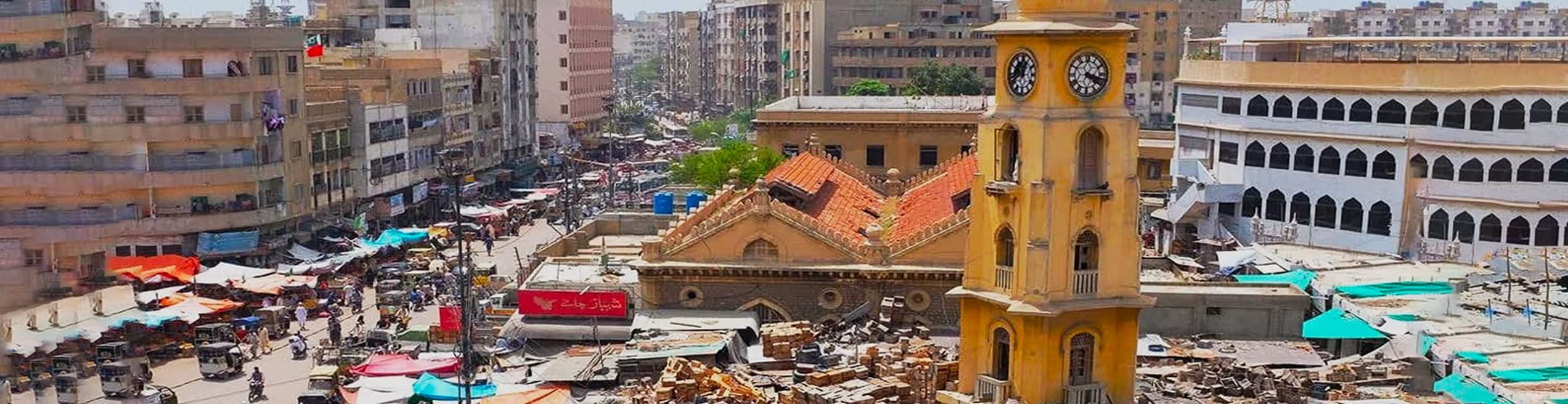 Saddar Karachi overview including history, population, climate, geography, map location, transportation network, major roads, markets, landmarks, economy, commercial activity, culture, lifestyle and area facts.